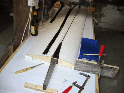 Na internetu je postupů opravdu nepřeberné množství, každý modelář má svůj názor na věc. Rozhodl jsem se vydat cestou uhlíkového trámce a spojek křídel, stejně, jako to mají například kompozitové speciály F3J/B. Pro pokus výroby jsem zvolil malý díl právě ve tvaru spojek křídel a uch kompozitových větroňů. Ale jak na to? Napadlo mě pro výrobu formy použít Vivak tloušťky 1 mm, co se používá na výrobu kabin modelů letadel. Dá se velmi dobře lepit vteřinovým lepidlem a práce s ním není náročná. Stačí z něj uříznout dno, dvě bočnice a víko budoucí formy. Ke dnu nalepit bočnice a po vytvrzení neseparovat voskem. Namíchal jsem tedy směs Epoxidu L285 + tvrdidlo a prosytil uhlíkový roving. Byl jsem velice mile překvapen pevností a přesností takto zhotoveného dílu, i s požadovaným lomením. Stejnou metodou jsem vyrobil i trámce křídel. Vyzkoušel jsem nejprve dva tvarově totožné, které se zasouvají proti sobě do centroplánu v trupu. Úspěšně jsem je vyzkoušel na větroni DG 1000 o 6metrovém rozpětí. …